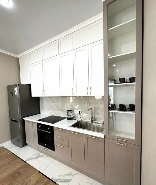 Все элементы кухни изготовлены с использованием качественной фурнитуры и материалов, что гарантирует долговечность и удобство в эксплуатации.