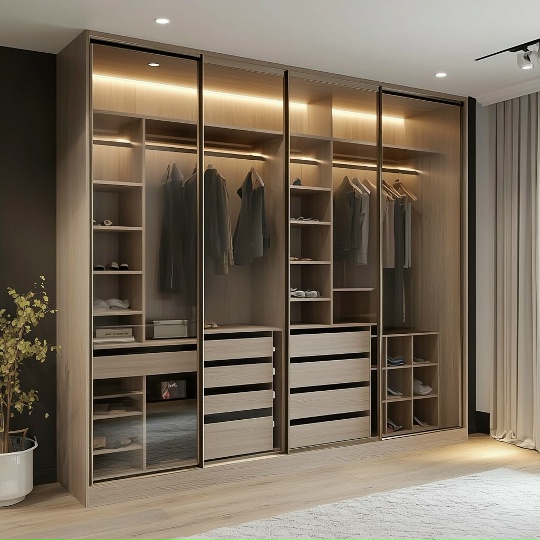 Внутри шкаф продуман до мелочей: штанги, полки, ящики и секции располагаются по вашему желанию. Возможна модульная или встроенная конфигурация. Фурнитура подбирается индивидуально: доводчики, подсветка, ручки и выдвижные системы.