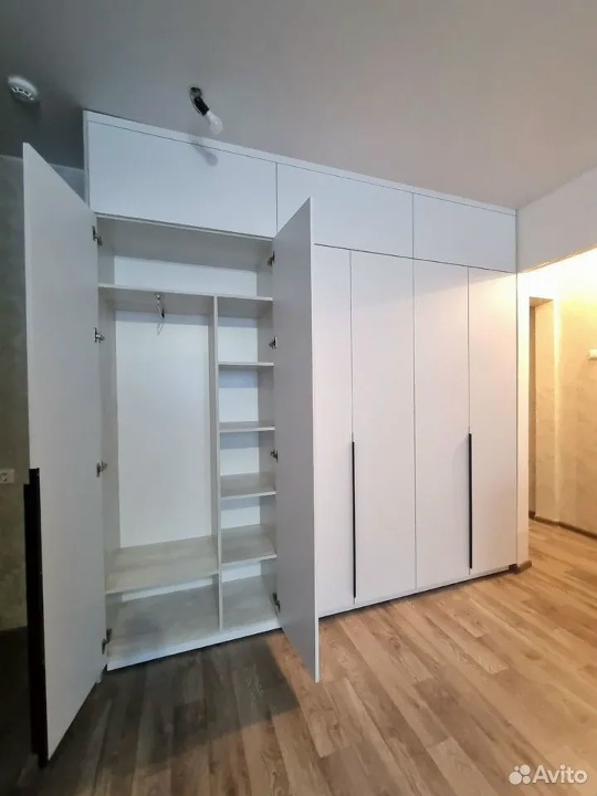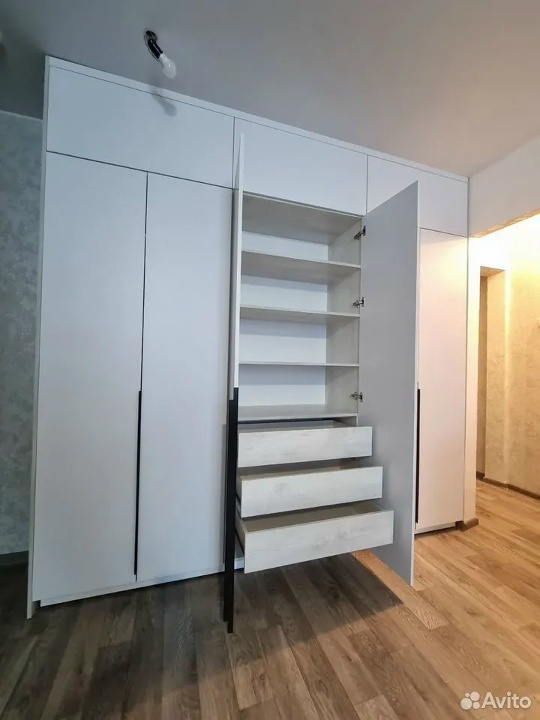 Используем плиты Egger и Visio, фурнитуру с доводчиками и надёжными направляющими. Возможны матовые, глянцевые и текстурные покрытия, добавление подсветки, стекла и металлических акцентов.