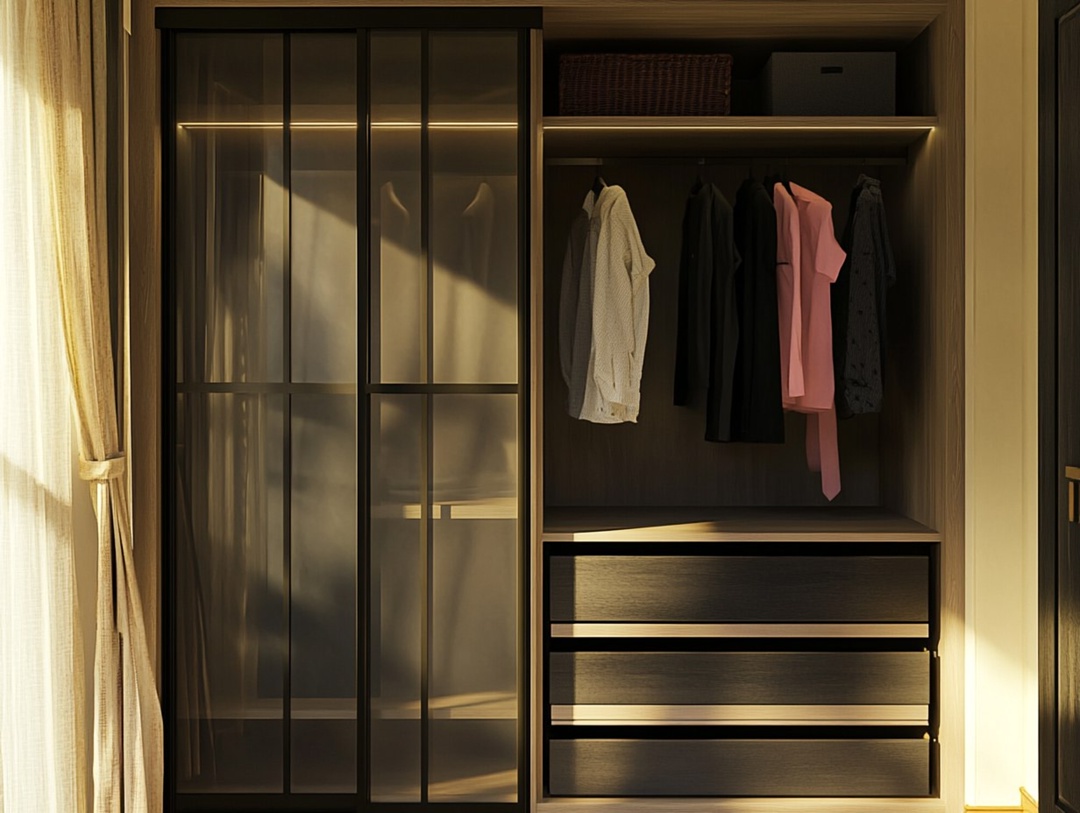 Компактная, но функциональная гардеробная станет гармоничным решением для спальни, прихожей или отдельной ниши. Теплый оттенок дуба сочетается с современными стеклянными вставками, создавая ощущение уюта и порядка.