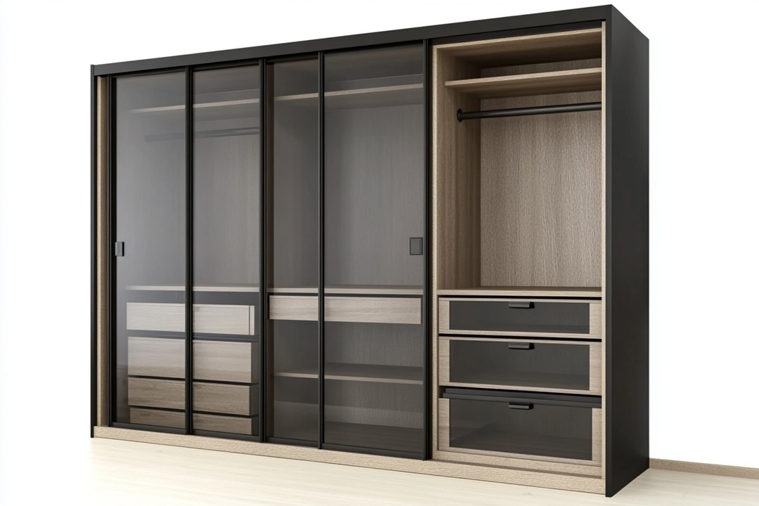 Компактная, но функциональная гардеробная станет гармоничным решением для спальни, прихожей или отдельной ниши. Теплый оттенок дуба сочетается с современными стеклянными вставками, создавая ощущение уюта и порядка.